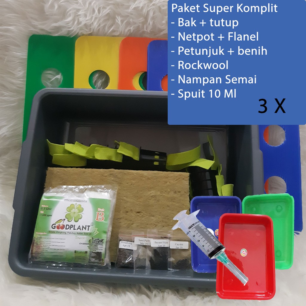 Barang yang sangat cocok bagi anda yang ingin menanam hidroponik sendiri paket yang kami jual sudah lengkap untuk sistem wick tinggal praktek saja 1 paket terdiri dari : - 3 bak (warna tergantung stock)- 3 tutup impraboard (9 lobang) - 27 netpot + sumbu - 1/4 slab Rockwool- 1 bungkus nutrisi AB Mix goodplant (500 ml) - 4 benih sayuran Repack (Pakcoy / bayan hijau / bayam merah / kangkung / caysim / selada) - Petunjuk (dari awal sampai panen) - 1 buah Nampan Semai Komet No 1- 1 Buah Spuit