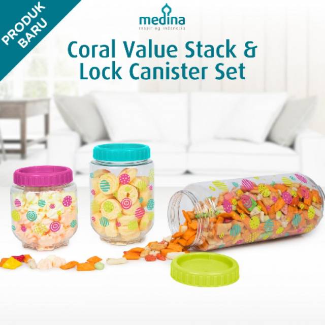 Coral Value Stack & Lock Canister SetSeri TERBARU dari Coral yang fenomenal!!Hadirkan nuansa ceria di ruang tamu atau dapur Anda dengan design eksklusif yang cantik dan modern. Badan toples terbuat dari material Plastik PET menjadikannya kuat dan tidak mudah pecah, serta aman untuk menyimpan camilan AndaDengan sistem pengunci antar toples yang unik, menjadikannya dapat ditumpuk sehingga hemat tempat saat disimpan. 1 set terdiri dari 3 pcs, dengan:- Kapasitas 700 ml uk. 10 x 10 x 11.8 cm- Kapasitas 950 ml uk. 10 x 10 x 14.8 cm- Kapasitas 1760 ml uk. 10 x 10 x 25.5 cmBerat Produk - Volume : 0.9 kg- Real : 0.9 kg#medinaplastikhalal#medina#halal#canistercantik#BPAf