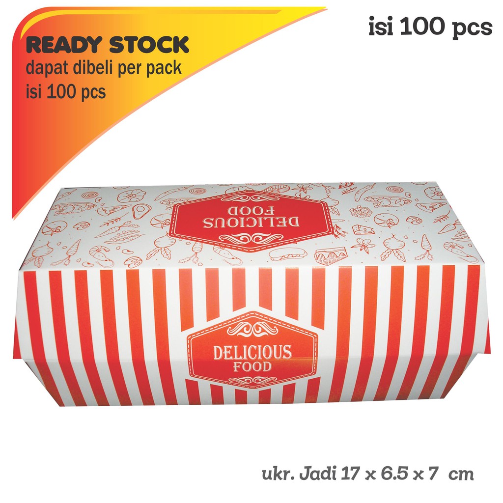 HARGA 1 PACK ISI 100 PCSDus Box Kemasan HOTDOG uk 17x6,5 x tinggi 7 cm Foodgrade Bahan Ivory Foodgrade ( Gambar sesuai di display)Isi 100 pcs / p