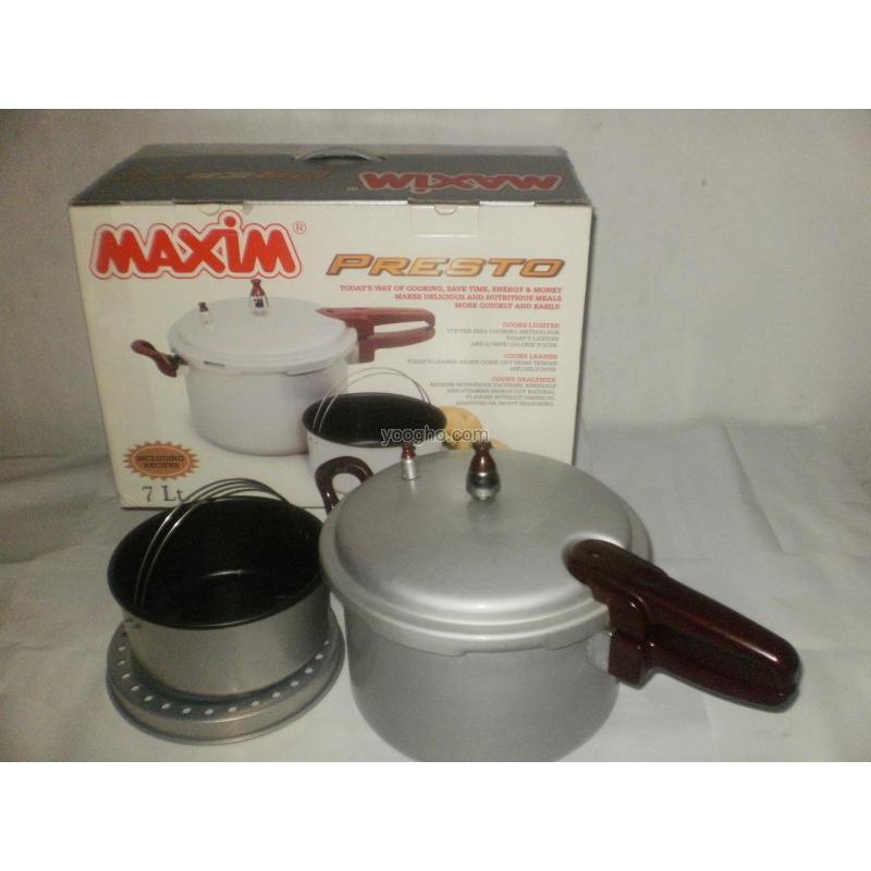 Panci Presto - MAXIM PRESTO 7 L- Diamter 26 cm dan Tinggi 16 cm- Tersedia sarangan- Tersedia 1 panci kecil berlapis teflon- Bahan aluminium berkualitas tinggi- Dilapisi dengan lapisan soft anodize- Tahan gesekan, asam, basa, dan menyebarkan panas secara merata- Gagang anti panas- Karet silicon terbuat dari bahan berkualitas tinggi, sehingga tidak mudah lapuk dan tahan uap